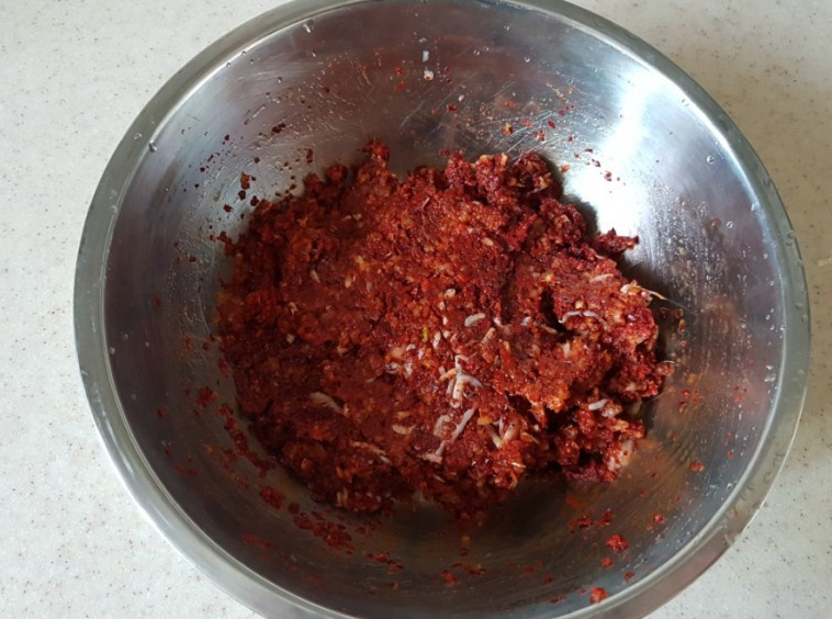 2단계는 양념장을 만드는 과정이에요. 큰 볼에 고춧가루, 액젓, 새우젓, 다진 마늘, 다진 생강, 설탕, 식힌 찹쌀풀을 넣고 골고루 섞어주세요. 이때 살짝 간을 봐도 좋아요. 단맛과 짠맛의 밸런스가 맞으면 성공이에요!