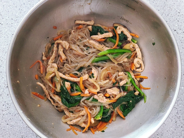 볶은 재료들은 큰 볼에 하나씩 차곡차곡 담아두고, 당면은 마지막에 넣는 게 좋아요. 삶아서 기름 코팅해 둔 당면을 넣기 전에, 준비한 간장 양념의 절반을 미리 당면에 버무려두면 맛이 훨씬 더 잘 배요. 그리고 모든 재료를 한꺼번에 섞지 말고, 두세 번에 나눠서 버무리는 게 좋아요!