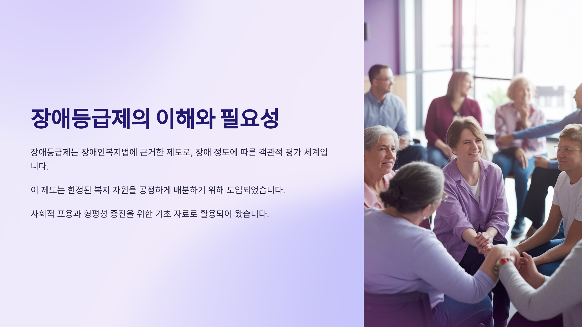이전에는 장애등급에 따라 일괄적으로 복지 혜택이 주어졌다면, 지금은 개인별 맞춤 지원이 강화되었어요. 예를 들어, 같은 장애를 가진 사람이라도 생활 환경과 필요에 따라 차별화된 지원을 받을 수 있어요.