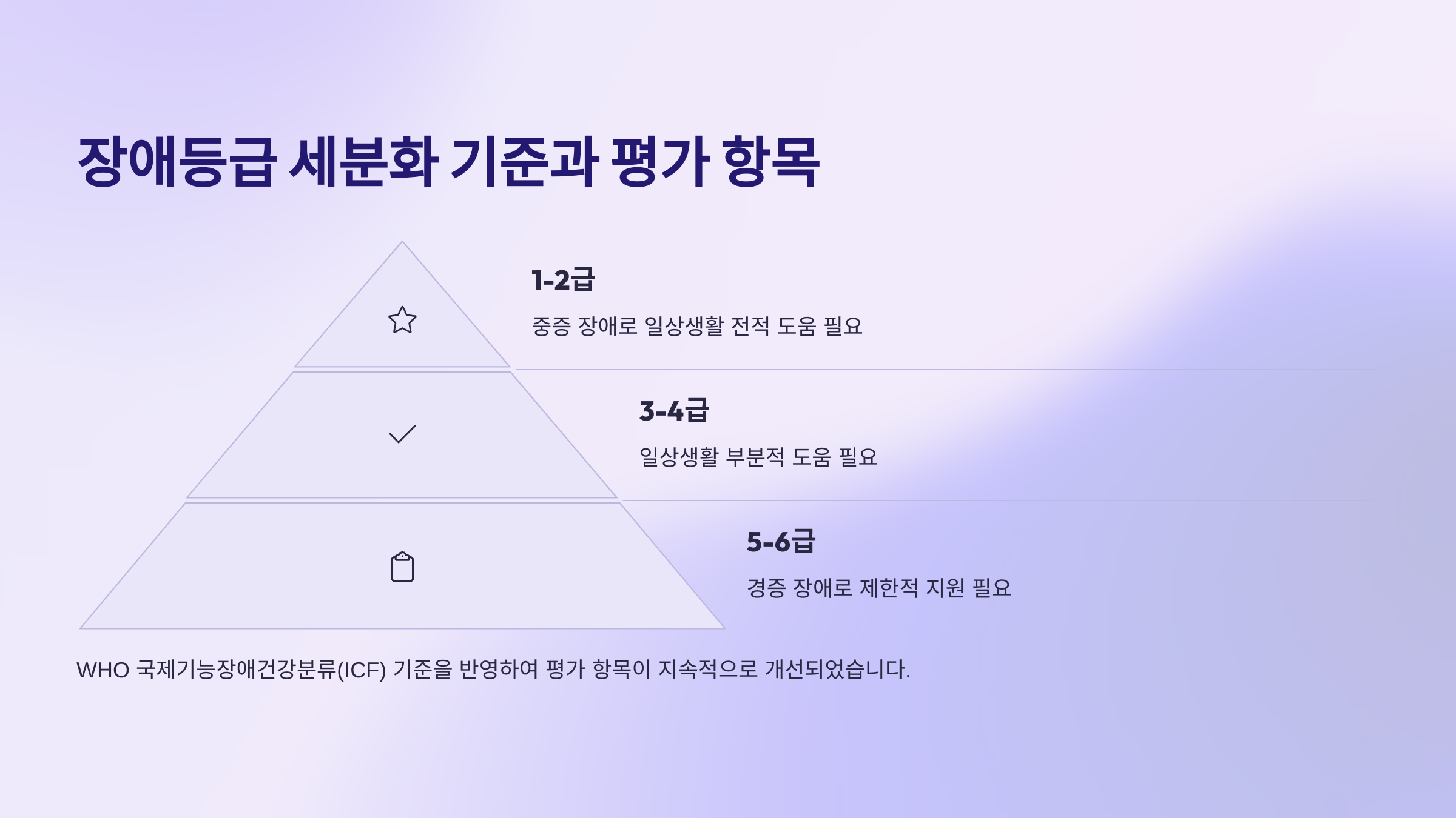 2019년 7월 장애등급제가 폐지되면서 기존의 1급~6급 체계가 사라졌어요. 대신 장애 정도를 '심한 장애'와 '심하지 않은 장애'로 구분하는 방식이 도입되었죠.
